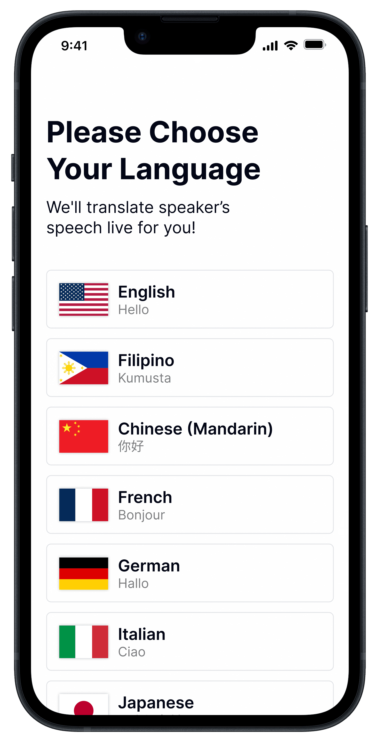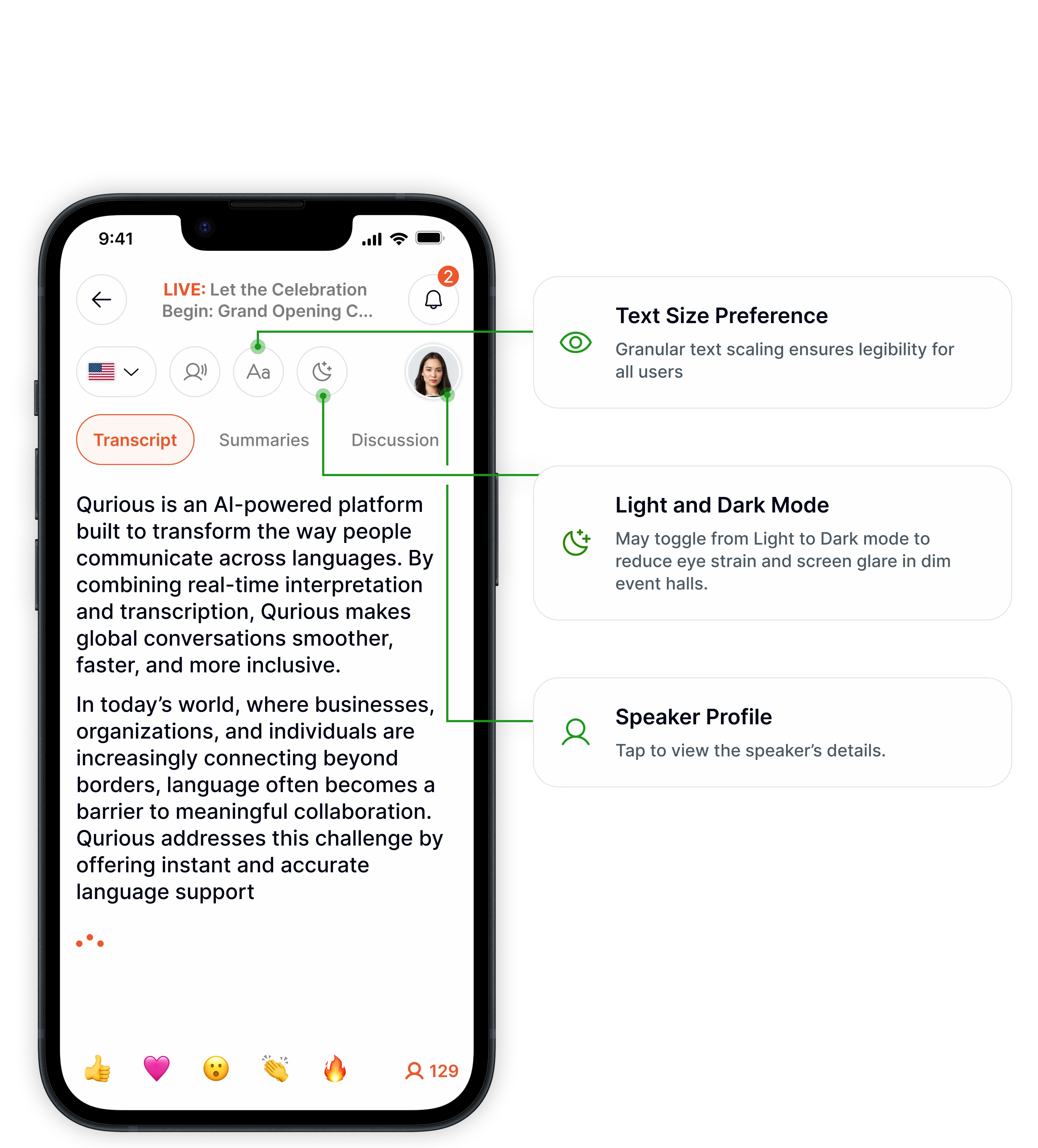 Transcription Tab: See the real-time translation of speaker’s speech.
